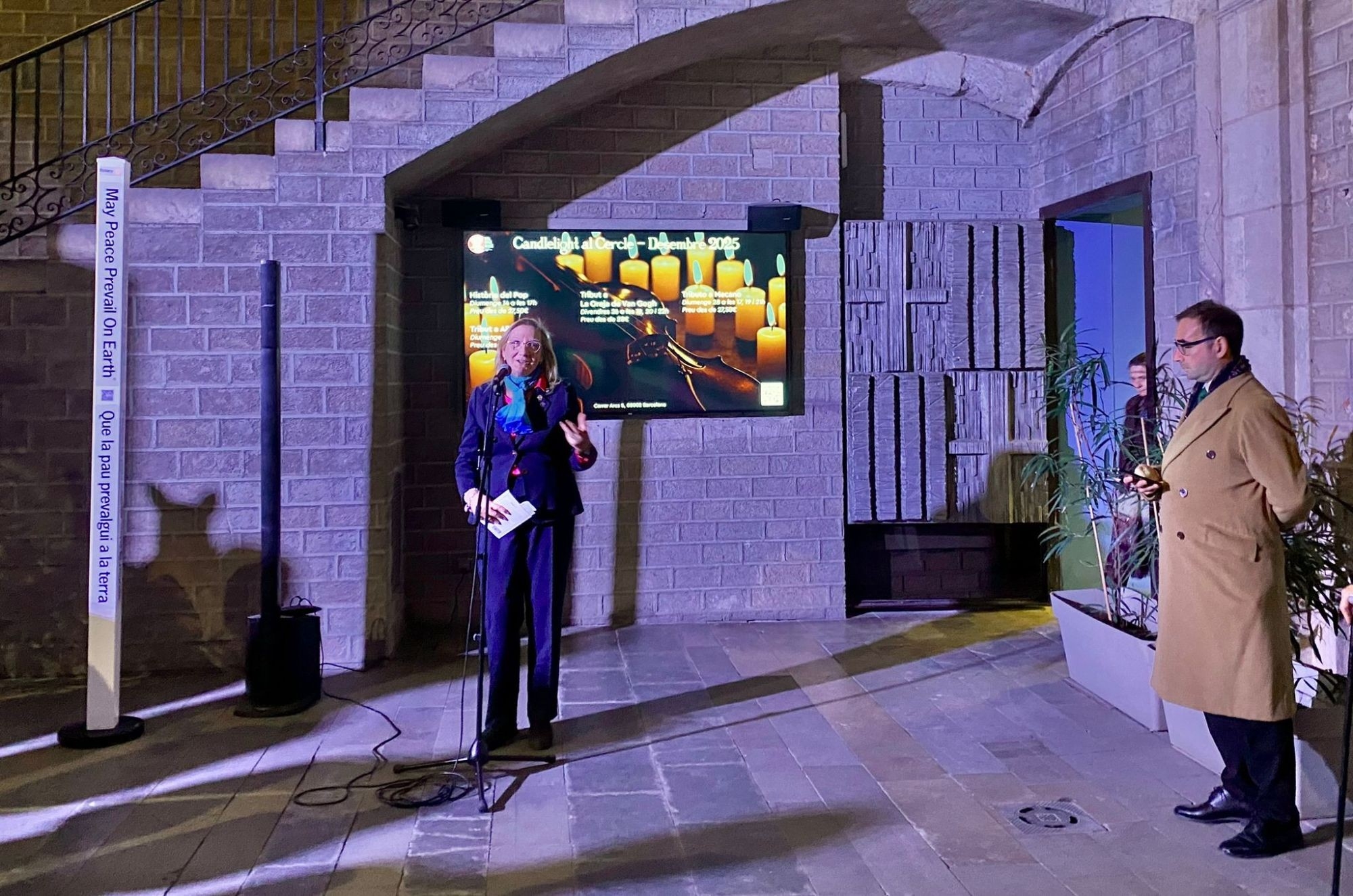 En un acto sencillo, pero profundamente solemne, el Cercle Artístic de Barcelona acogió ayer la instalación oficial del primer Poste de Paz de la ciudad. El poste, símbolo internacional del compromiso con la paz, fue entregado en su día por la Gobernadora del Distrito, Montserrat (Montse) Moral, al presidente del Cercle Artístic y al presidente del Rotary Club Barcelona Mar, en el marco del Concierto por la Paz celebrado durante la visita de la presidenta de Rotary International, Stephanie Urchick.